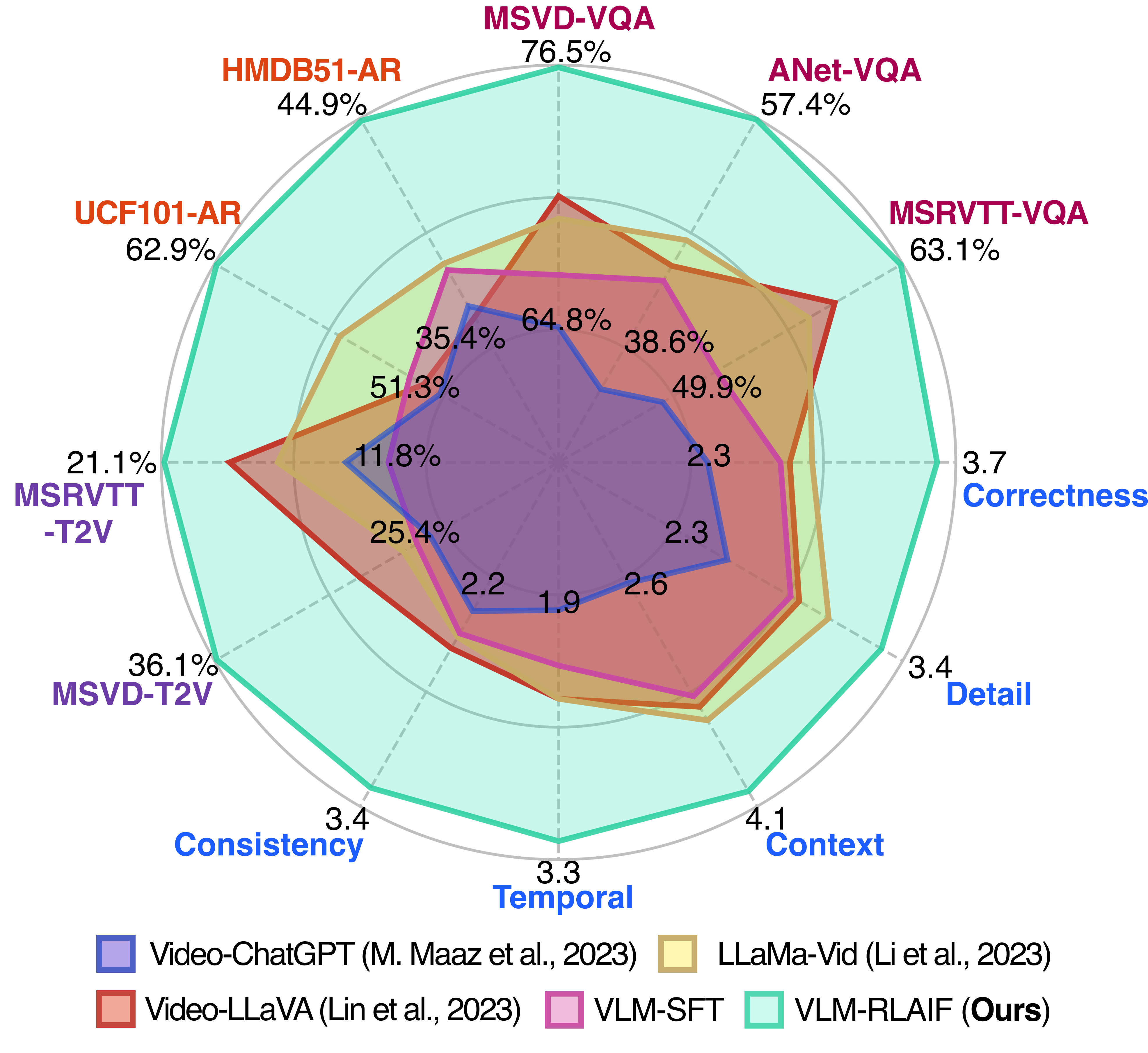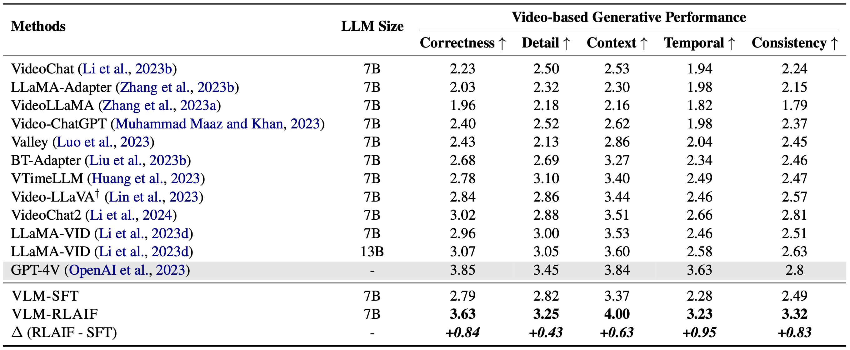 We quantitatively evaluate VLMMs on the video-based generative performance benchmark that measures five criteria of generated text, showing effectiveness of our proposed VLM-RLAIF.