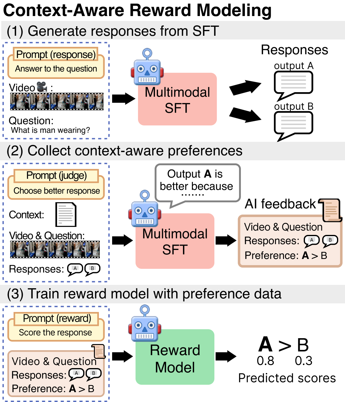 The right figure illustrates the three stages of the proposed context-aware reward modeling: