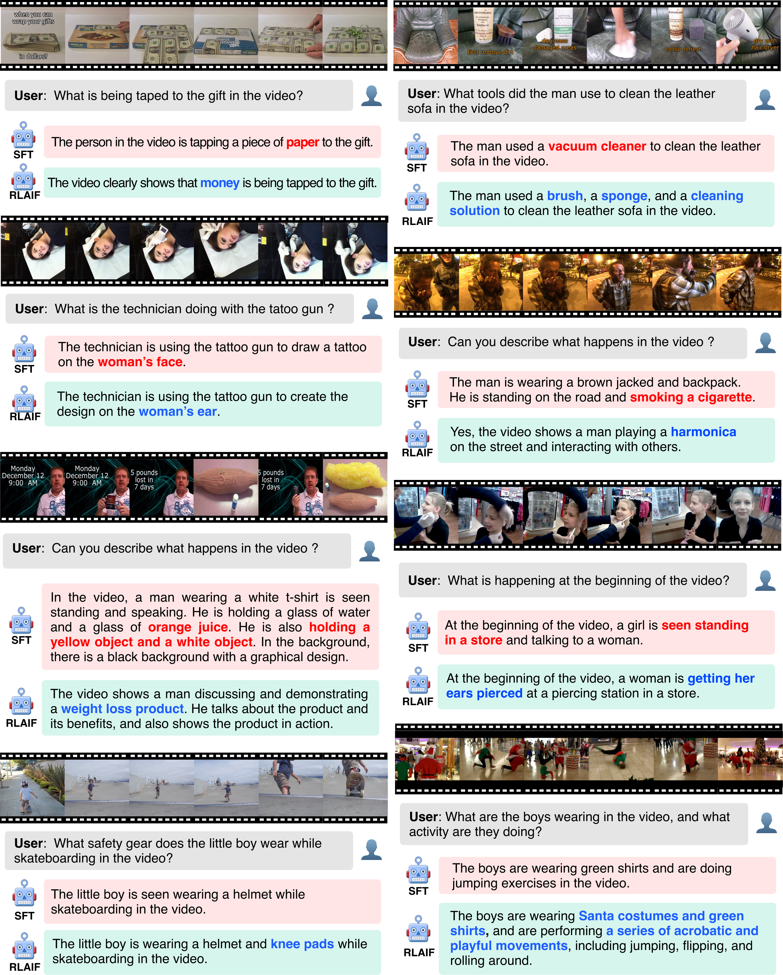 We qualitatively compares the performance of VLM-SFT and VLM-RLAIF, highlighting their multimodal understanding capabilities below Figure. VLM-RLAIF consistently yields more accurate answers than VLM-SFT, as highlighted in blue for accurate responses and red for less accurate ones.